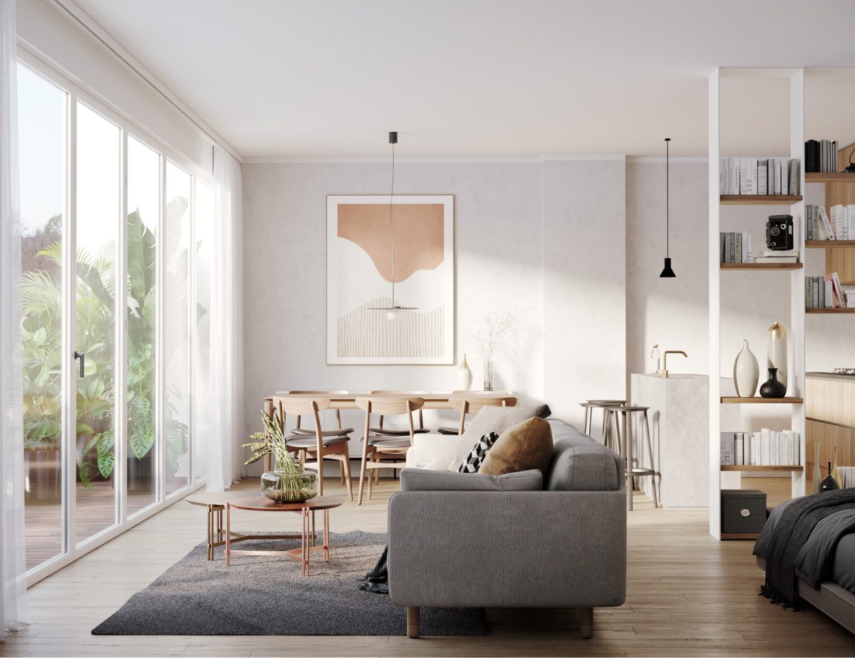 Im rückwärtigen Teil des Appartements befindet sich jetzt der Eingangsbereich inklusive Einbauschränke mit Sitzbank und Garderobe, Küchenzeile und Bad. Dem schließt sich ein großzügiger Wohn- und Essbereich an, der von einer durchgehenden bodentiefen Fensterfassade flankiert wird. Alles ist hell belichtet und der Blick fällt ungehindert aufs Schloss Charlottenburg. Der Schlafbereich befindet sich im hinteren Teil des Wohnbereiches, abgetrennt durch einen Raumteiler. Ein Materialmix aus Holz, Weiß und Grautönen sowie edle Messingarmaturen runden das zeitgemäße Loft-Feeling ab.